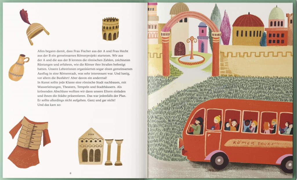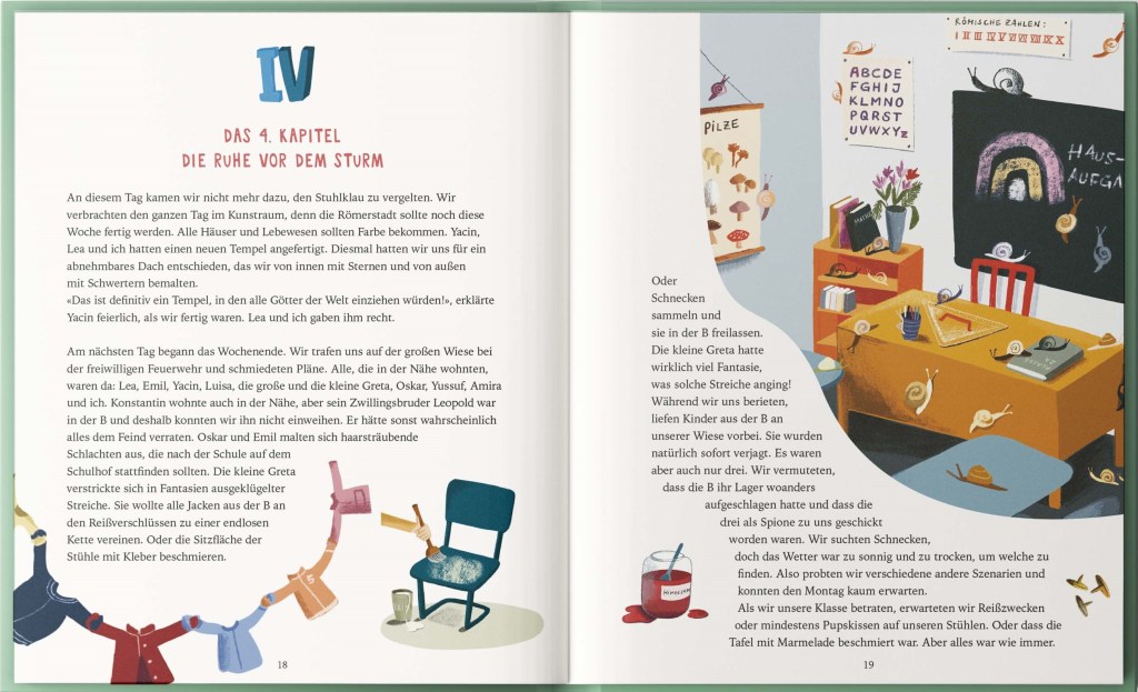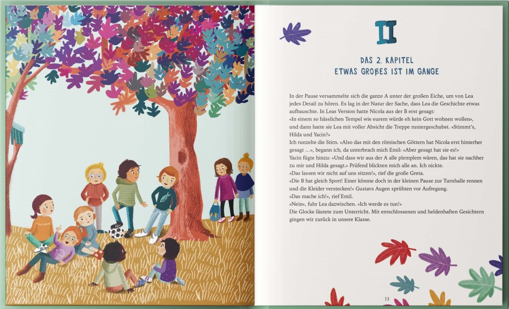 Da alle Kinder gleichzeitig im selben Dilemma sind, fällt es ihnen relativ leicht, aufeinander zuzugehen: Sie sitzen im selben Boot. Und sie denken nach. Was ist schiefgegangen? Wer hätte eingreifen können, wie und wann? Was kann man machen, um den Frieden zu bewahren? Wie können wir miteinander umgehen, damit kein Krieg mehr entsteht? Welche Maßnahmen können wir auch in Friedenszeiten ergreifen? Die beiden Klassen gestehen sich ihre Schuld ein. Und dann brainstormen sie. Gemeinsam. Hilda kann ihren Augen kaum trauen, als sie das sieht. Ihre Idee funktioniert. Ihre Vision wird wahr. Anstelle ihrer Römerstädte präsentieren sie schließlich den Eltern ihre Ideen für den Frieden: Von Gesprächsregeln über den Mut „Stopp“ zu sagen, von Austausch-Projekten über Meditationen, gibt es so viele Dinge, die wir tun können, um Frieden zu finden und zu bewahren. Und zum Schluss kann man Bücher darüber schreiben. Und sie (vor)lesen.