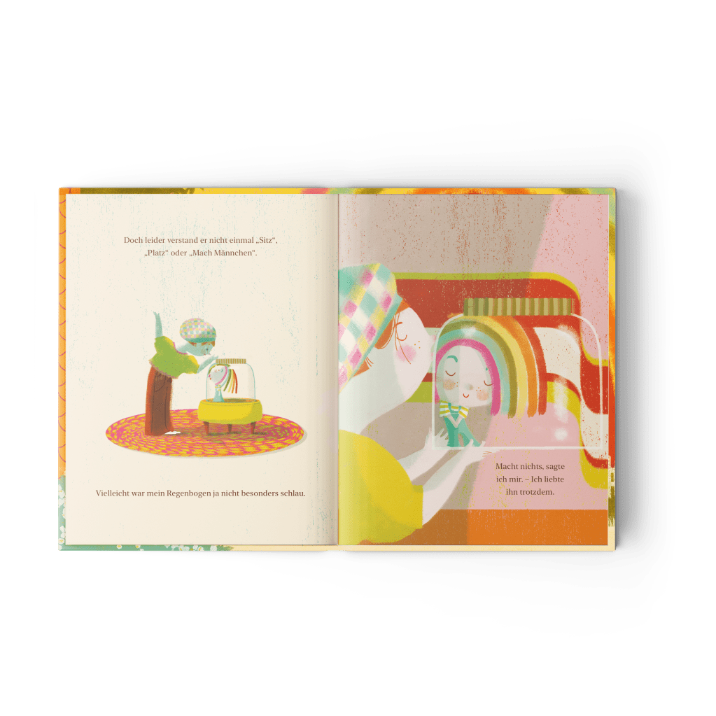 Eines sonnigen Morgens fängt ein kleines Mädchen einen Regenbogen und sperrt ihn in ein Gefäß. Sofort werden die beiden unzertrennliche Freunde. Doch der Regenbogen hat Heimweh, und trotz aller Bemühungen des Mädchens wird er immer unglücklicher. Das Mädchen erkennt schließlich, dass es eine schwierige Entscheidung treffen muss, damit es seinem Freund wieder gut geht.